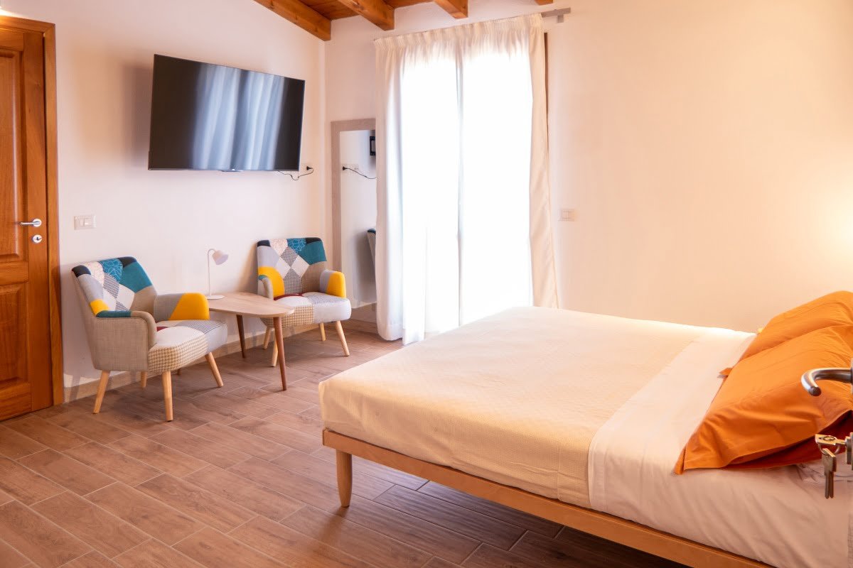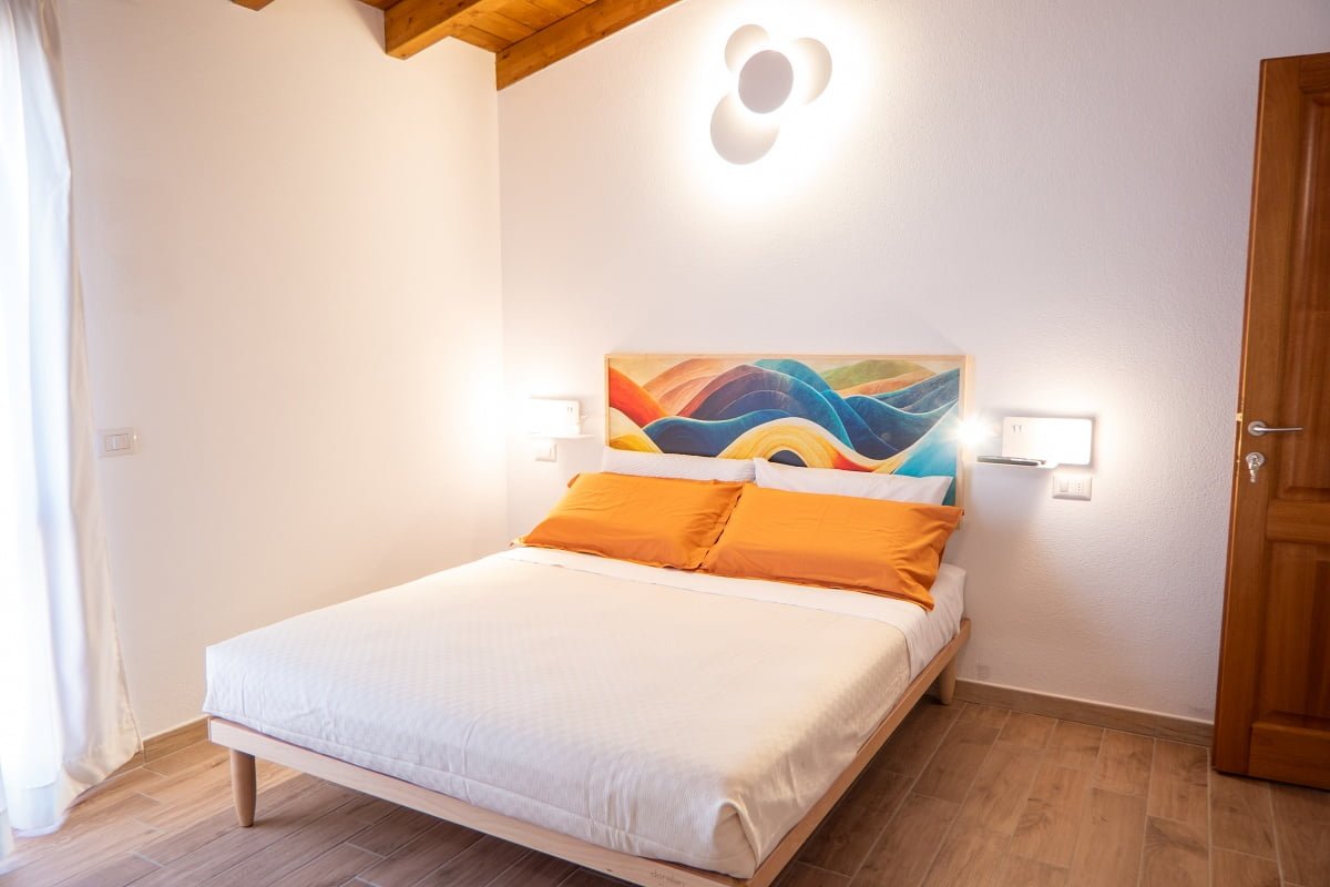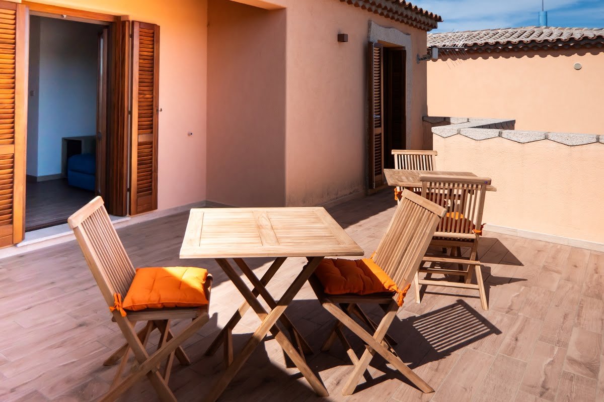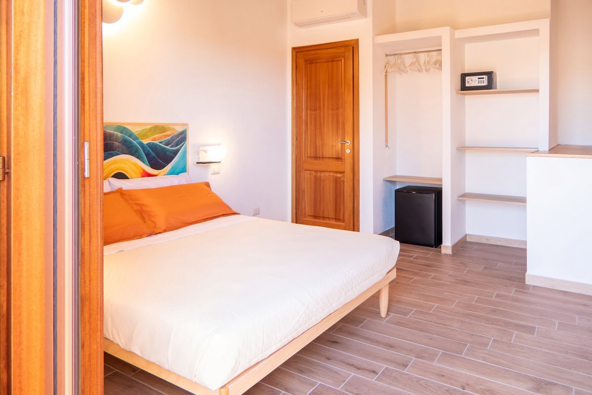 La Camera Sabbia di Acquarello Rooms è l’ideale per trascorrere una vacanza in coppia a San Teodoro, situata al primo piano della struttura è dotata di balcone con tavolini.