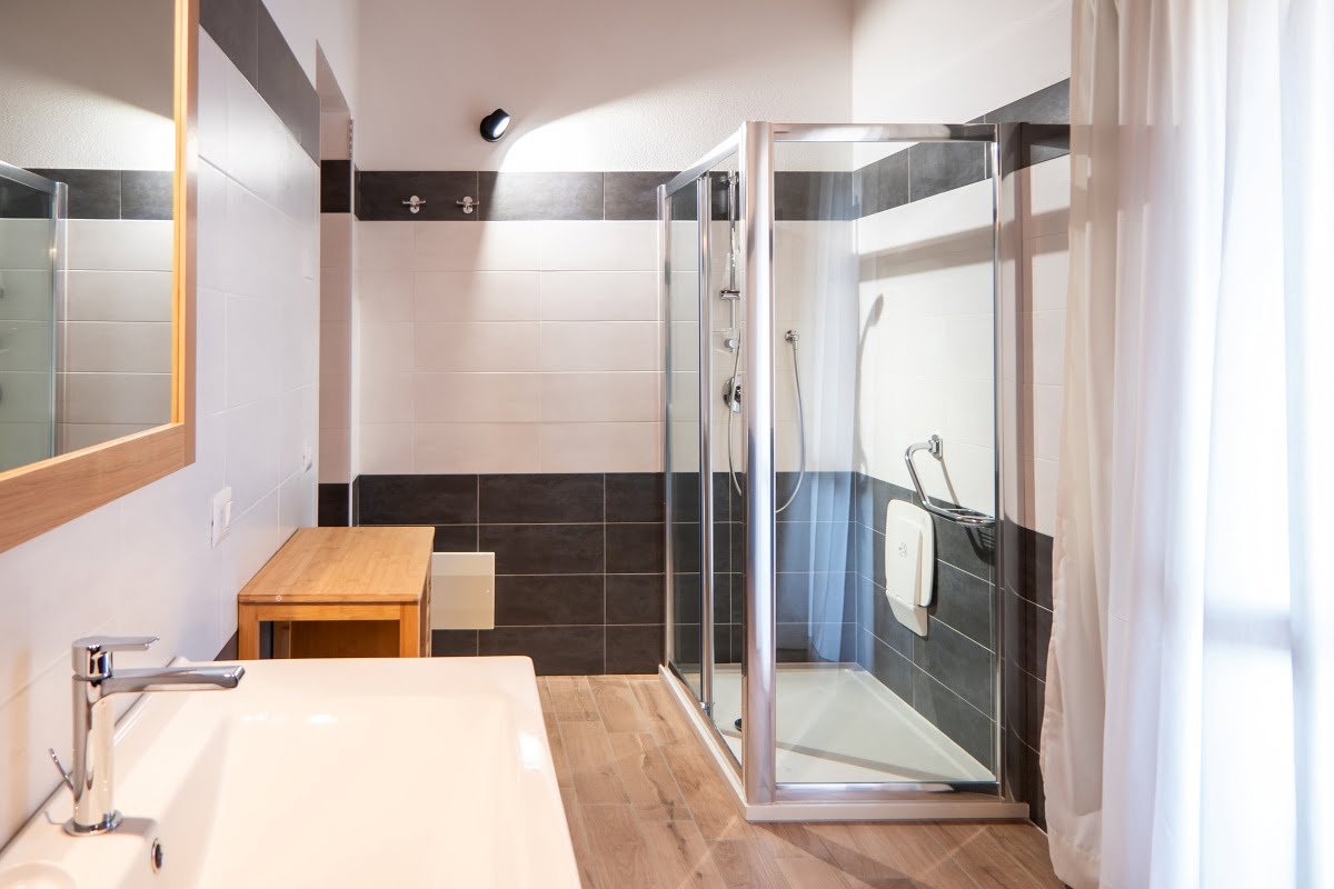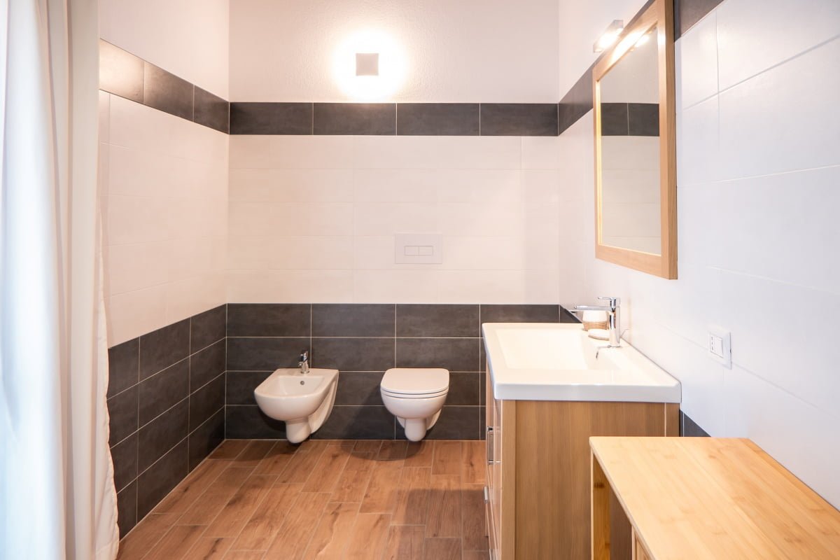 Il bagno è dotato di doccia, asciugacapelli, lavandino e bidet.